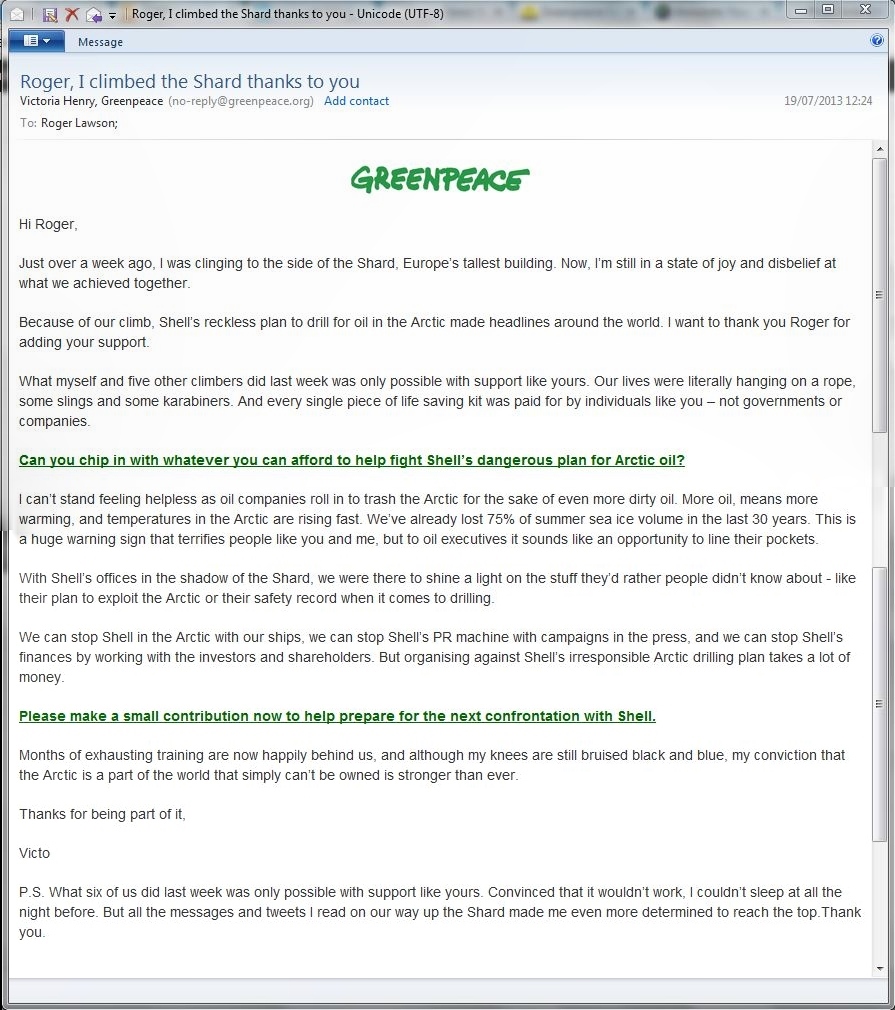 Two hours later, I received an emailed ask from Victoria Henry (one of the climbers). I’d love to think that everyone at Greenpeace read my blog and that it changed their approach to integrating fundraising into their campaigns, but maybe it was just a coincidence. But I thought it only fair to update my thoughts here.