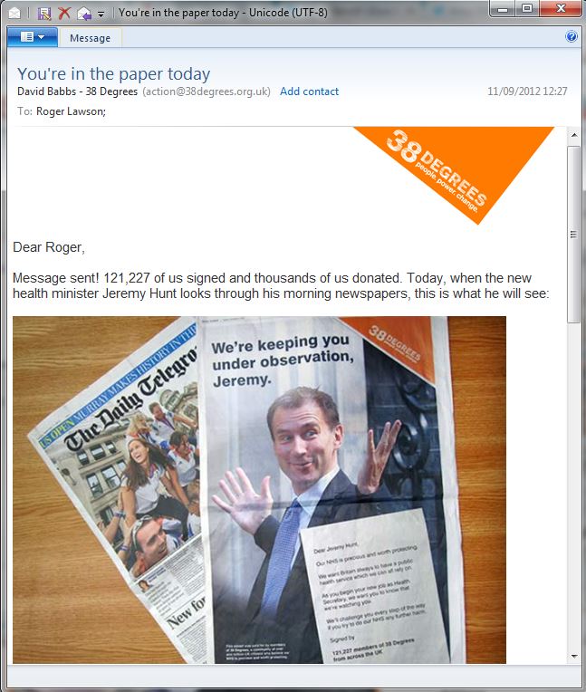But this wasn’t any ordinary ask. 38 Degrees’ plan was to buy some advertising space in ‘The Times – Hunt’s favourite newspaper’. To ‘prove we really mean business, and put our message where he really won’t want to see it. Can you chip in to splash our warning to Jeremy Hunt across a full-page advert in The Telegraph or The Times?’