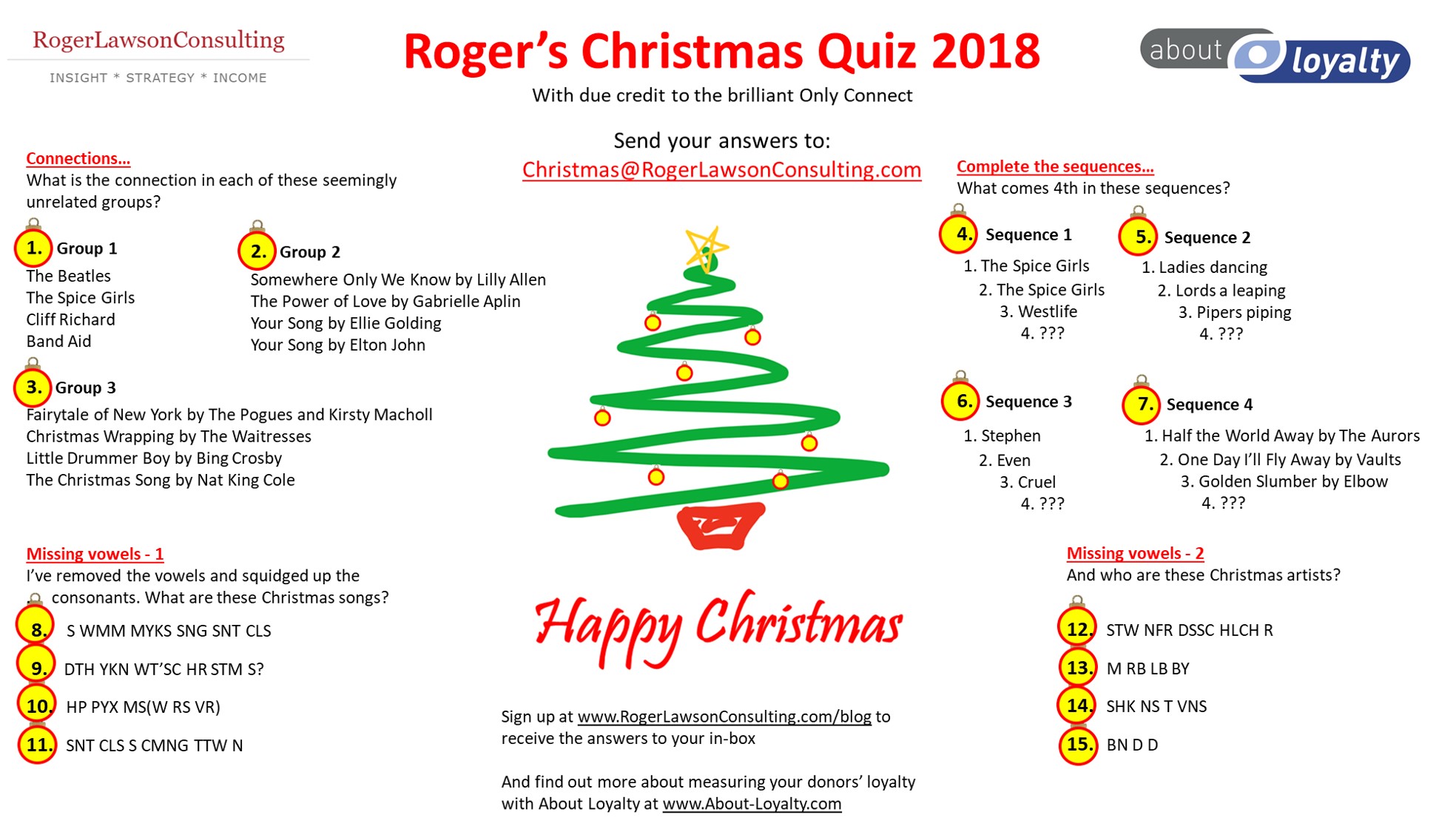 I think some of these are a bit tricky, so please send in as many answers as you can get, to me at Christmas@RogerLawsonConsulting.com.
